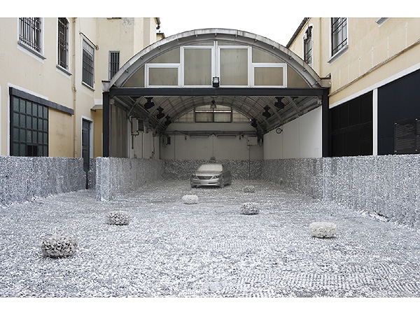 建築家の乾久美子氏を家具と会場のデザイナーに抜擢した今回のレクサス。銀色の紙を切り抜いて作った床と壁に埋もれる車。静かなラグジュアリーを感じさせる空間