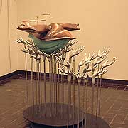『庭園』と名づけられた染織の作品。景石に見立てられた大きなバッグは壮観。そして、砂紋として使われているこの小さなつぶつぶ、実は飴なんです。