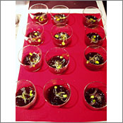 オープニングパーティーでは、レストラン L'ARPEGE より特別ビュッフェを用意し、A.PASSARD の創作料理を準備するなど、もてなしにも格別の注意を払う。“miroir ARTELANO ”(アルテラノ ミラー)は、砂糖大根をサラダゼリーに仕立て、スライスした玉ネギを載せた。もう一品は、シャーレのようなガラス皿にオレンジ、ベージュ(濃い+薄い)の3点盛り合わせと、中身は秘密。実験的な挑戦を試みるARTELANOのパーティーは、毎回、訪れた人々を心から歓迎してくれる。そのせいか、人々の表情にも笑みが絶えず、つい長居してしまうのである。