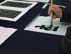 「偏っていてはダメですが、全てをいきなり高い完成度で成し遂げるのも難しい。だから僕のゼミの学生に、書道、楷書を学ばせています。合宿では3食用意するけど寝ないで書く(笑)。そうすると、夜中に神が降りてきて、手の中に入ってくる。完全なグラフィックデザインと言っていい中国伝来の文字を書き続けることで、技術はもちろん、文字や言葉の深い関係を知り、これをどう表現するかという発想につながってくるのです。朝起きたら中心から外に向かって、筆で右巻き、左巻きの渦を書く。どんな完成度の高いグラフィックも、スタートは1本の線からだという精神を身に付ける訓練。筆触(ひっしょく/筆と紙の摩擦)が思考する感覚を覚えていくのです」
