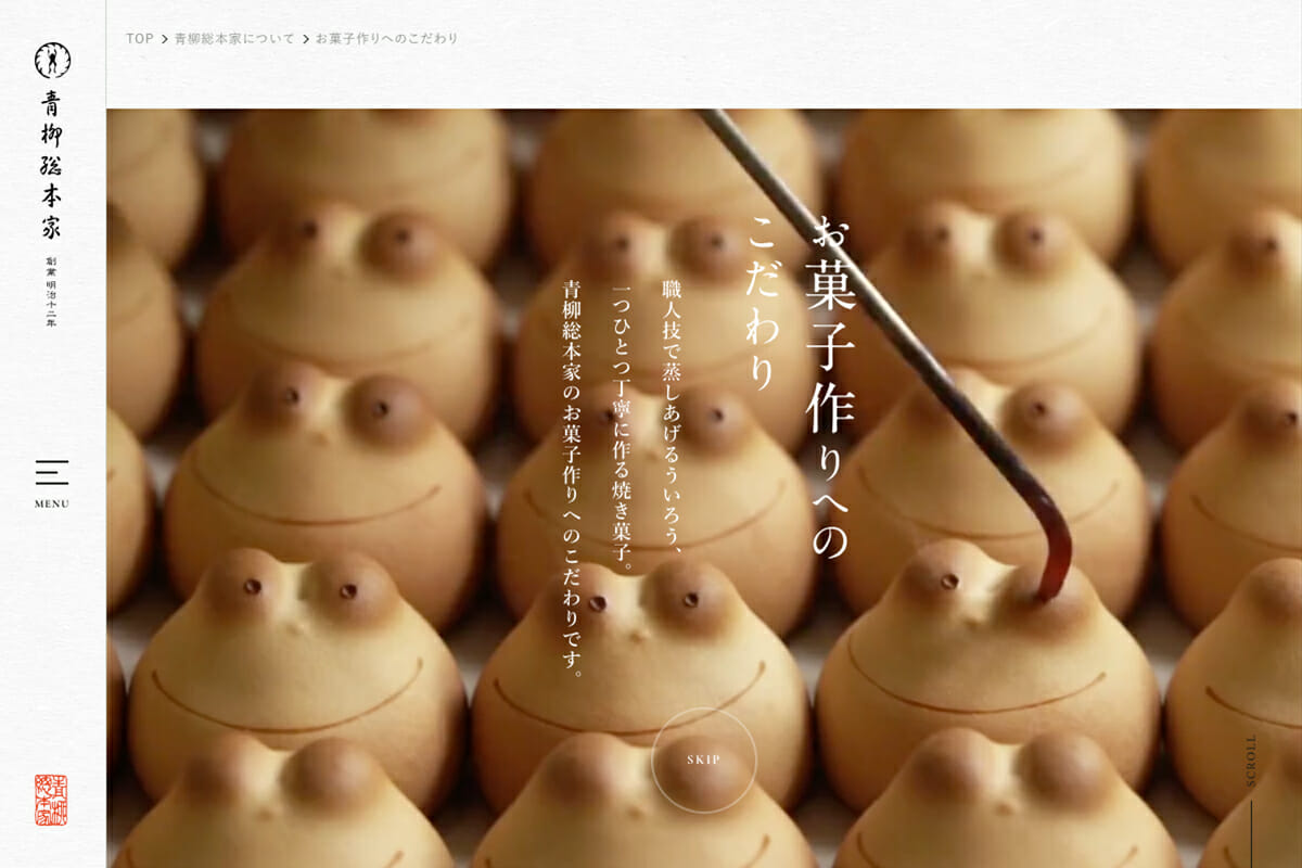 キービジュアルはカエルが跳んだ波紋をWebGLで表現しています。また写真もすべて撮り直し、イラストを使った動画をつくることで、歴史や商品のことを知っていただけるようになりました。
