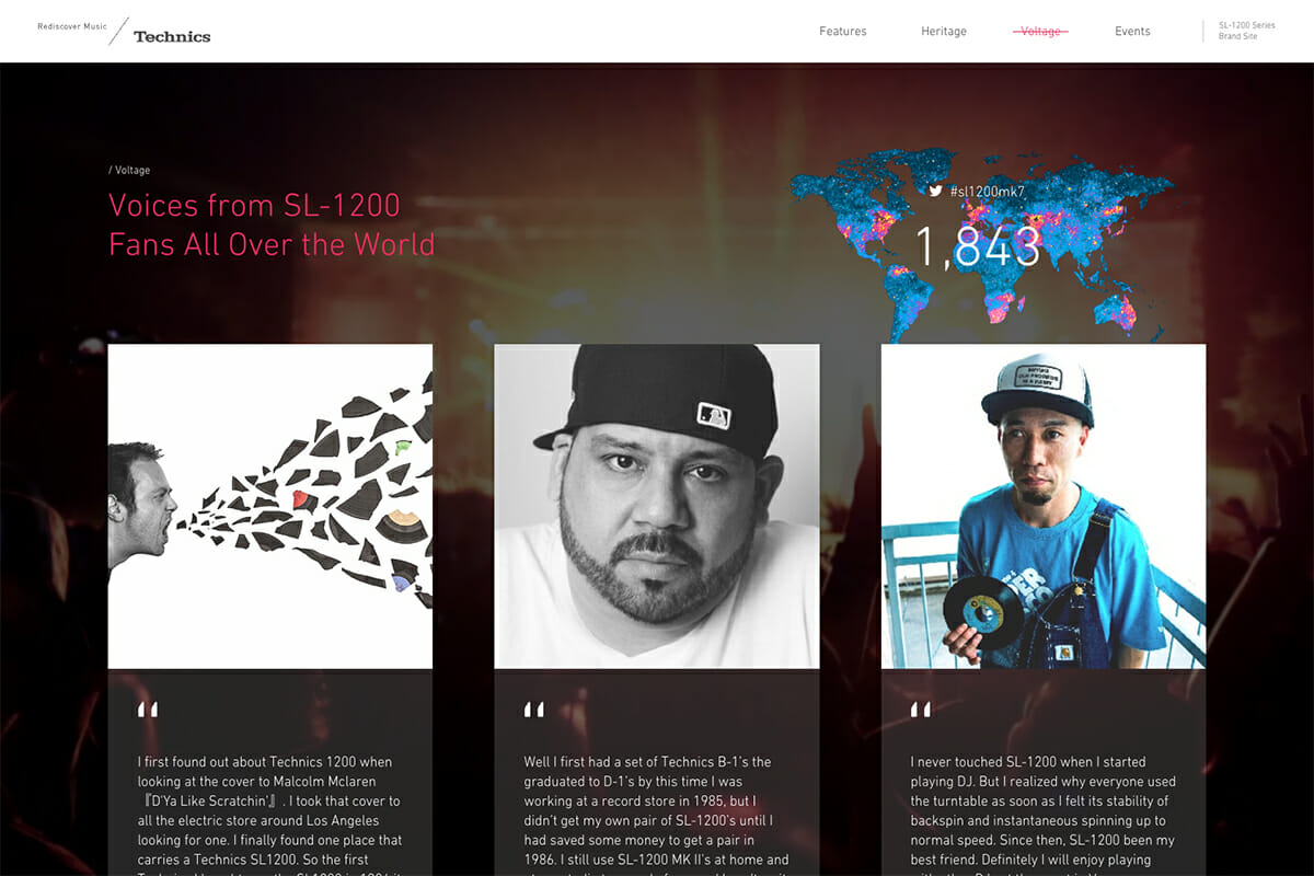 『SL-1200 Series』の持つ魅力とファンの熱気を余すことなく伝えることを目指して制作しています。当初は、米国ラスベガスの見本市・CES 2019(1月開催)で9年ぶりに発表された新作『SL-1200 MK7』のブランドサイト制作のご依頼でした。しかし、『SL-1200 Series』は世界中にファンが多いので、今回はシリーズ全体にレンジを広げ、『SL-1200』の「魅力」「歴史」「ファンの声」など、複数の側面から『SL-1200』のブランドをしっかり伝えることを提案しました。古来のファンも新規のファンも楽しめるブランドサイトになったと思います。