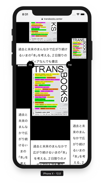 「TRANS BOOKS」は、電子も非電子もそれ以外も、メディアを問わず、どんな本でも購入できるブックフェアとして、2017年から開催しています。いまならではの「本」と「読書」の可能性を実験的に考える場を目指しています。2018年11月の開催にあたり、Webサイトとグラフィックを制作・公開しました。