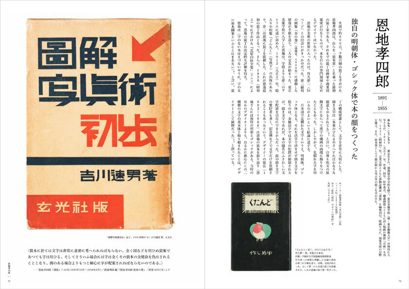 本書は、作家ごとにその「描き文字」仕事をまとめて紹介した一冊です。明治以前、明治、大正、昭和と、作家の生年順に掲載することで、時代ごとの空気や作風の変化、印刷技術の変化や歴史の流れを感じながら、描き文字を見ていただくことができます。