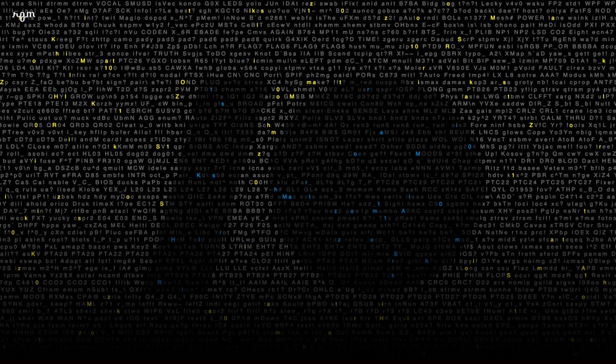 木村:ライゾマティクスの10年間を視覚的に伝えるために、一般的なライゾマティクスのイメージ=テクノロジー=プログラミングをモチーフにしています。いままで書かれたプログラミングのコードをワード解析し、出てくる頻度が高い順に左上から配置しています。その中で、「Rhizomatiks 10」という文字は黄色でハイライトすることで、10年の膨大な歩みを星空として表現しました。印刷物では遠くから見ると「10」という数字に注目するけれど、近くに寄ることでプログラマにはお馴染みのワードで構成されていることがわかる、という二段想定にしています。