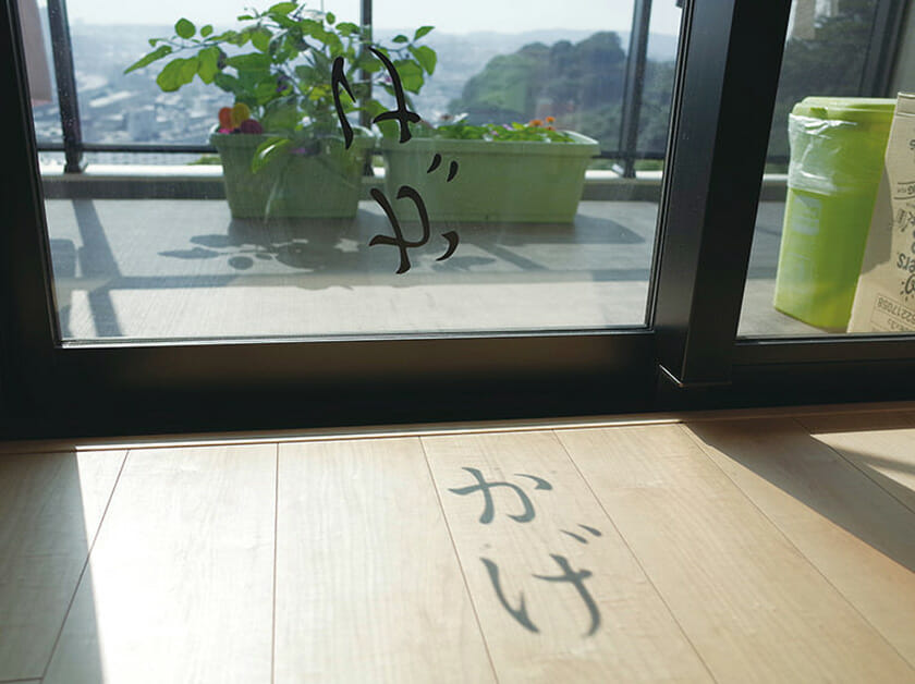 窓から差し込む光や影、お風呂、鏡など、日常生活の中に、ひらがなを配置して、楽しみながら、自然と覚えてもらう「空間あいうえお表」です。