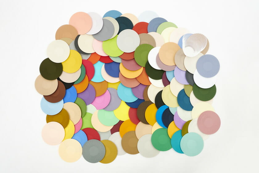 120色の空気の器は、福永紙工と竹尾とのコラボレーション企画。福永紙工の山田祥子さんに企画意図をうかがったところ、「空気の器は2010年に発表してから、まる8年が経ちました。直径20cmの円形の型を変えることなく、空気の器を長く楽しんでもらえるように展開をしてきました。9年目となる、次の展開を考えた時にあえて素材に立ち返り、紙の風合いや色に着目した空気の器があったなら、折り紙、画用紙のような感覚で空気の器を素材として使ってもらえる。いろいろな人の発想の素になって、世界中で楽しい作品が生まれる予感がします」とのお返事をいただきました。