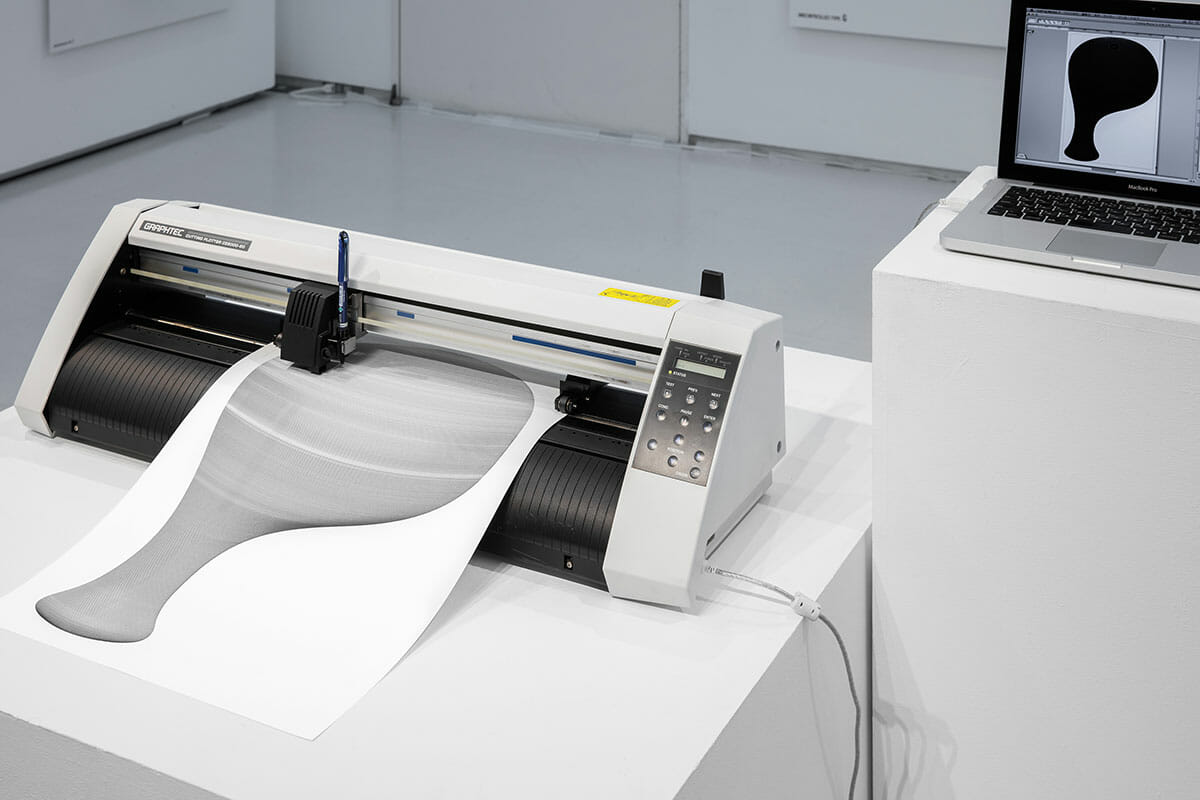こちらがその作品、「Plotter Drawing」。カッティングプロッター(データに沿って刃先が動き、紙などをカットできる機械)の刃の部分に筆記具をとりつけ、紙に描くことでデジタルデータにはない、濃淡や揺らぎのある線が生まれます。デジタルとアナログの融合により、見たことのない不思議な表現が出現するのです。