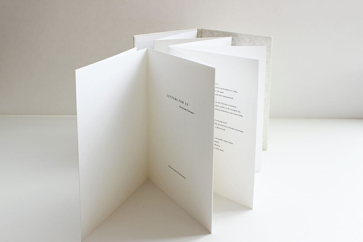 こちらが本を開いたところ。本のサイズはA5判。A4サイズを二つ折りにした紙を交互に重ねて貼り合わせ、美篶堂が蛇腹状に仕立てたもの。本文用紙には、「ルミネッセンス」「ヴァンヌーボV」「ヴァンヌーボ スムース-FS」「アラベール」が候補に挙がり、実際にそれぞれの用紙に活版印刷をして刷り上がりを比較したそう。刷られた文字の表情の良さから「ヴァンヌーボV」が選ばれました。また、蛇腹を包む表紙には、和紙(楮)を使用。50部のみの特装本には本革(牛革)が使われています。