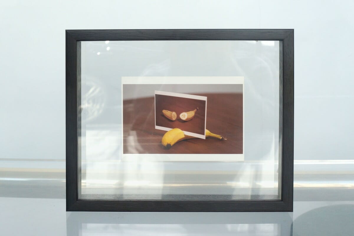 これがちょっとずるいなあと思ったのは、バナナを切っている写真が実は展示会のDMなんです。展示会に行ったら、そのDM自体が作品として売ってるんですよ。「えー捨てちゃったよ……!」っていう(笑)。タダでもらえるDMと数万円で売っている作品の間にある違いは「考え方」「コンセプト」です。つまり「コンセプトだけを売っている」とも言える。こうした考え方にちょっと笑ってしまったので、これは買うしかないかなって。