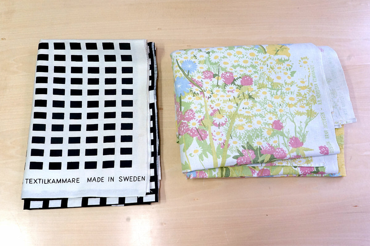 この2つの生地は、最近出張でフィンランドに行ったときにヴィンテージ屋さんで手に入れました。どちらも1940~1950年代のものだと思いますが、花柄の方はアルネ・ヤコブセンのデザインしたテキスタイル、もうひとつはアルヴァ・アアルトがデザインしたものです。