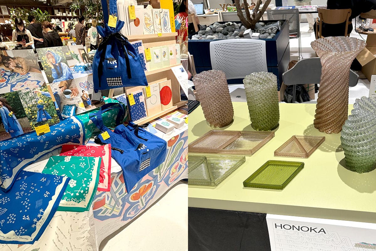 (左)グラフィックデザイナーの青山希望さん(non Editions)は、自身のアートワークを使ったプロダクトブランド「uki by non Editions」を出展(右)デザインラボ「HONOKA」は、2023ミラノサローネ・サテリテでグランプリを受賞した「TATAMI ReFAB PROJECT」の作品を出展