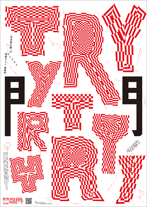 『登竜門を「挑戦の象徴」として捉え、「TRY」の3文字を無数に配置して構成しました。中央には、漢字の「門」を分解して左右に配置し、挑戦者を迎え入れる「門の扉」を象徴的に表現しています。多様な個性が集う場としての登竜門をイメージし、それぞれ異なる形状やチェッカー柄を重ねることで、既存のイメージを更新するようなデザインを目指しました』。