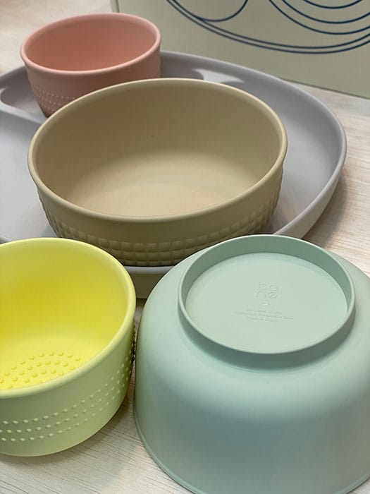 食育をコンセプトにした食器シリーズ。自然由来成分のみでつくられた製品がほとんどで、海洋生態系への影響が懸念されるマイクロプラスチックを生みません。表面の微細な仕上げを場所によって使い分けていたり、お椀の高台(こうだい)は型から抜くのが大変だったのではと思える高さだったりと、攻めたデザインです。