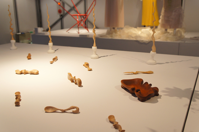 北村氏は家具手加工技能士の資格を持ち、DARON(ダロン)として木材を使用した彫刻品や加工品の制作を行っている。一見すると木のオブジェのように見える、カトラリー、トレー、指揮者用タクトなどの作品を展示