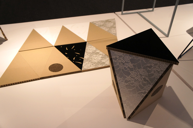 一枚の紙から折り加工のみで仕上げる一輪挿しなど、紙を使った生活雑貨を展示