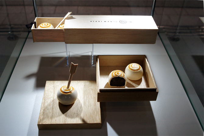 鈴木 萌乃「ATARI MANJU」/まんじゅうのまん中の的を矢の楊枝で射抜く、縁起のいいお菓子。商品化が決定し、2013年12月中旬(予定)より叶匠壽庵 全70店舗にて販売予定