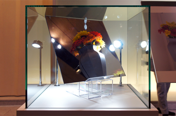 海福 恒太「In the mirror」/花を活けると鏡の中にも花があらわれる、真ん中に鏡がついた花瓶