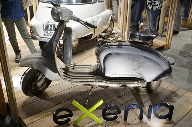 ミラノサローネこぼれネタ:ミラノサローネのブースより、ランブレッタと古い自動車