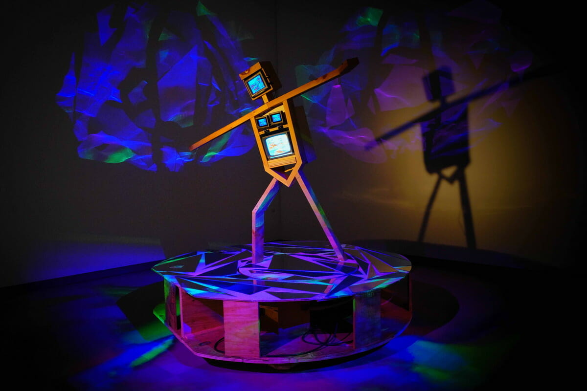 1960年代前半の東京で「グループ音楽」や「ハイレッド・センター」といった同世代の前衛芸術家たちの仕事に触発された久保田は、さらなる可能性を切り開くべく渡米します。ニューヨークでは、前衛芸術家集団「フルクサス」に参加するなど表現の幅を広げました。1970年代初頭にはパートナーであるヴィデオ・アーティストのナムジュン・パイク(1932-2006)を通じてヴィデオカメラを手に入れ、映像作品を手がけるようになります。これを機に、映像と彫刻を組み合わせた「ヴィデオ彫刻」の制作を始め、このジャンルの先駆的な存在として国際的に評価されました。本展では、代表作の「デュシャンピアナ」シリーズをはじめ、ヴィデオ彫刻、映像作品、それらのためのスケッチやアーカイヴ資料などにより、久保田の仕事を展覧します。