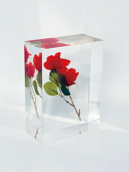 今回の小展示では、フラワーベースや《ミス・ブランチ》(1988)のマテリアルとして使われた薔薇を封印したアクリル・オブジェ(没後制作)、《Acrylic Stool》(1990)に使用された羽を浮かばせたアクリル・オブジェ(没後制作)、1990年に倉俣史朗がデザインしたモックアップを元に三保谷硝子が制作した香水瓶(没後製作)、《ガラスの椅子》の6分の1のミニチュア作品(没後製作)など10数点を展示します。また、国内外で開催された回顧展の貴重なポスターも合わせて数点展示します。