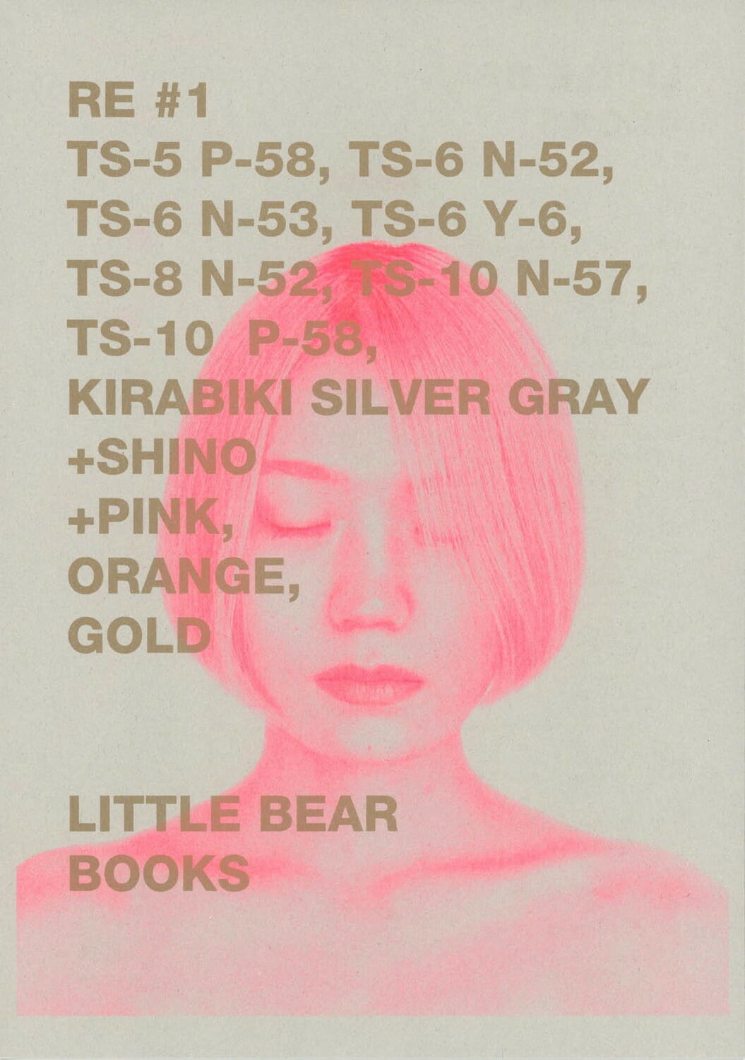 その中でメインとなるのは、平和紙業から用紙の提供を受けて制作した「LITTLE BEAR BOOKS #2『RE#1 TS-5 P-58, TS-6 N-52, TS-6 N-53, TS-6 Y-6, TS-8 N-52,TS-10 N-57, TS-10 P-58, KIRABIKI GINNEZU + SHINO + PINK,ORANGE,GOLD』」です。この長いタイトルは8種類の用紙名とその用紙上に刷られたイメージと印刷表現を指しており、常備在庫販売を終えた用紙や、廃棄する段ボールなどの経済的には不要となった紙を使用して、紙自体の存在感を感じさせる本に再生させることをコンセプトとしています。