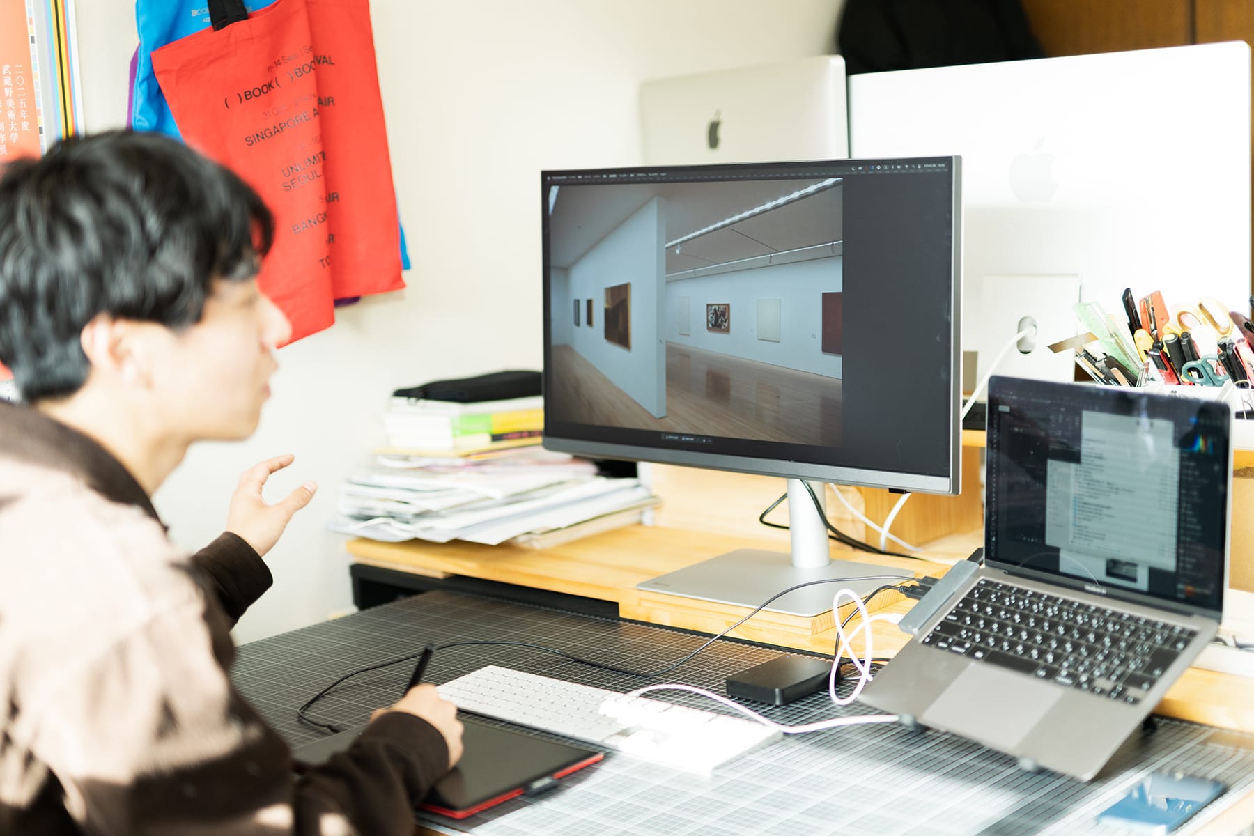 普段使いも出張のときなども、ワコムのペンタブを使って作業しています。マウスを使うデザイナーが多いかもしれませんが、僕は大学生のときにトラックパッドで作業していましたし、就職した先で使用していたこともあり、ペンタブしか使えないんですよね。