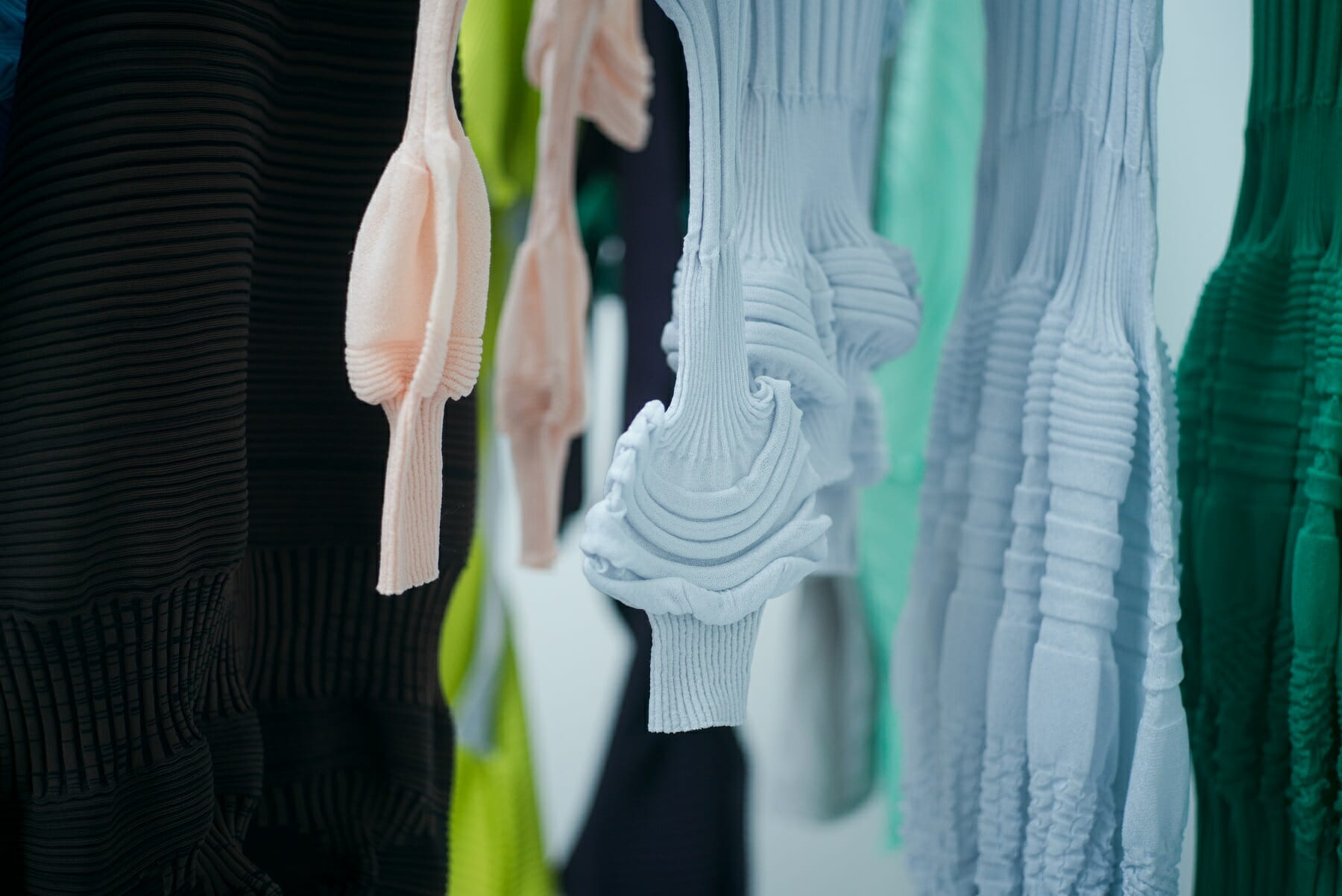 「四角い布という概念を一度なくしたいと思っています。どうしてもいい意味でも悪い意味でもISSEY MIYAKEっぽくなりすぎてしまう。でもいまは自由なかたちを模索しています」。