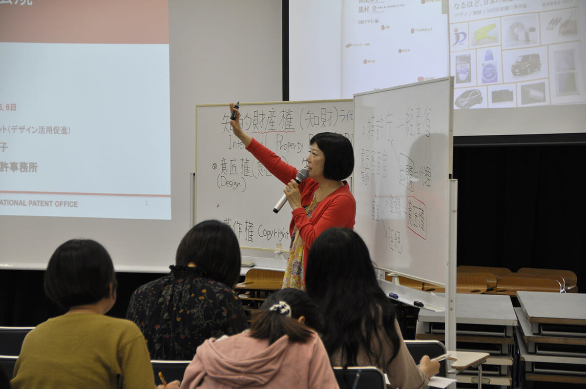 3年次には、デザイナーに必要な知的財産権を学ぶ「デザイン法規」の授業もおこなわれる。講師は弁理士の渡邉知子さん。