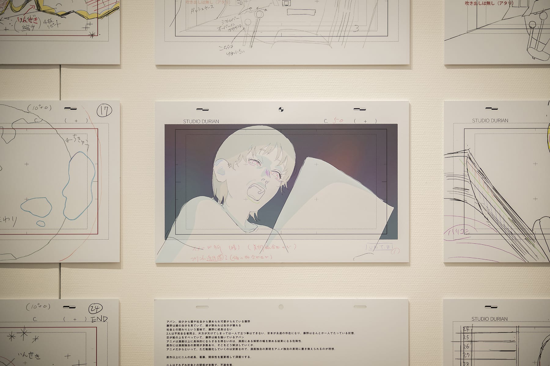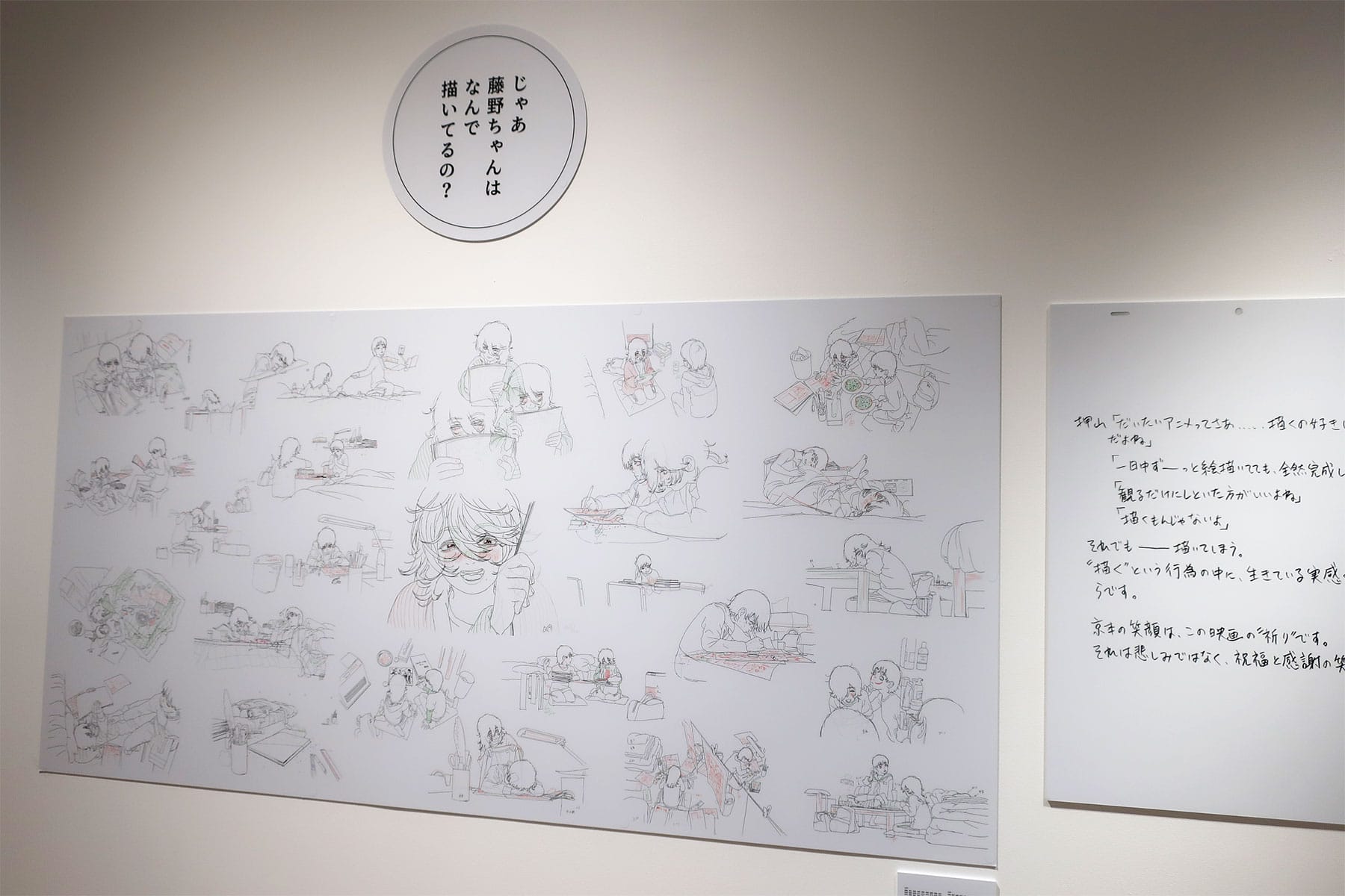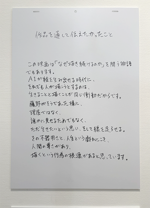 漫画原作とアニメーションでは表現が違ったように、映画と展示で同じストーリーを語るのであっても見せ方は変える必要があると思っていましたね。ただ絵を並べるだけではきっと伝えきれないと思ったので、シーンごとに解説テキストを書き下ろしたり、制作中に僕が覚書としてメモしていた文章を一緒に展示したりして。