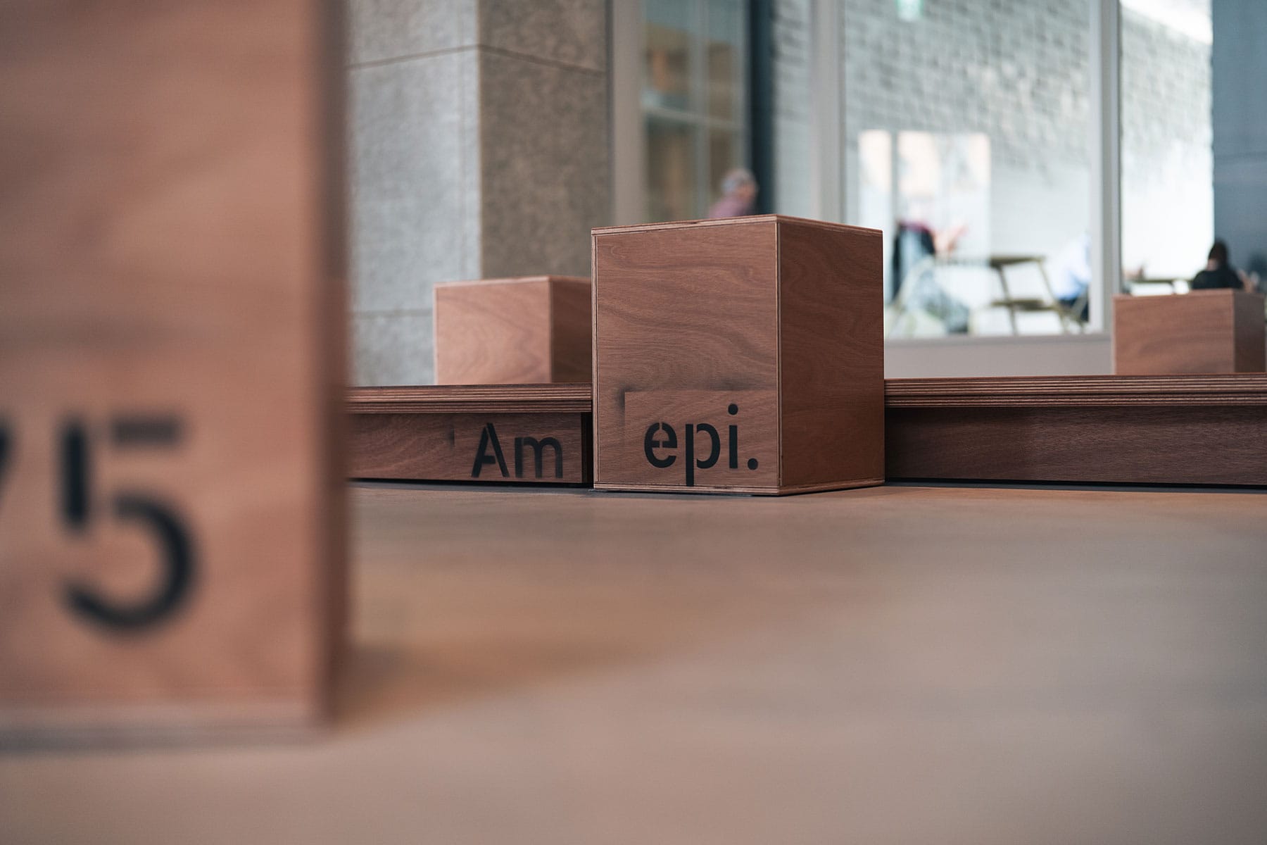 そのほかにも、入口すぐの柱に描かれた「Make Waves」のグラフィックもすべて手描きで表現していたり、使用する木材を選ぶために材木店まで足を運び、何百枚の合板から風合いの良いものを選定したり……話し出したらキリがないくらい、随所に思い入れがあります。