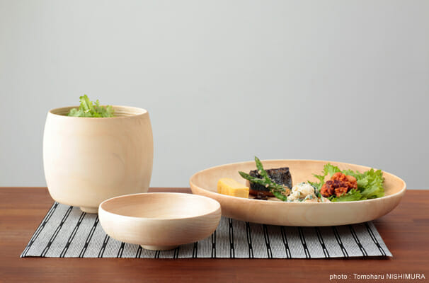 シンプルで山中漆器らしいウッドボウルというお題。1200年以上前から湯治客を招き、高度なろくろ技術を受け継ぐ山中漆器のおもてなしの具現化を考えました。盛付けを崩すことなく美しくしなやかに料理が出せるようにするため、木器ならではの持ち易い形が生まれました。