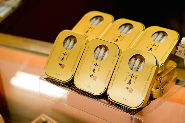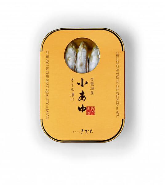 琵琶湖では、鮎は大きく成長せずに成魚になり、小鮎と呼ばれ珍重されています。これはその小鮎のオイル漬けの缶詰で、1000円近くする高級缶詰です。