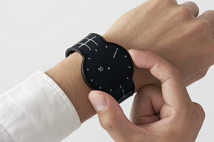 「さまざまな柄が投影される時計」として、腕時計の原形的なシルエットが際立つデザインとしました。浮かび上がるさまざまな柄が軽やかに移り変わっていく様は、ディスプレイにおける二次元の出来事ではなく、プロダクトのキャラクターや存在感そのものすら軽やかに移り変わっていく、まったく新しい体験です。
