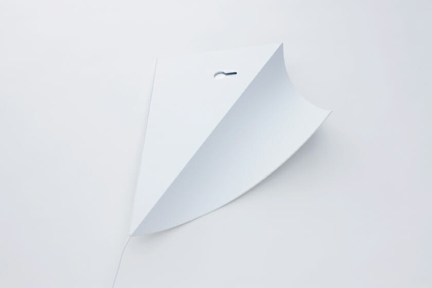 壁の端がめくれ、そこから光が漏れているように見える照明。LEDを用い光源を極限まで薄くし、電源コードを壁の隅に沿わせて目立たなくした。裏側の穴にフックを引っ掛けて壁に設置する。