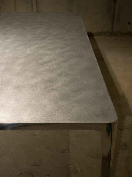 脚部の内側の曲線により、見る角度でさまざまな表情を見せる。テーブルトップはランダム(バイブレーション)に仕上げ、側面から脚部にかけては鏡面仕上げを施すことで、この仕上げのギャップがひとつのモノの中にメリハリを生んでいる。トップだけが水面に浮かんでいる氷のような印象を与える。