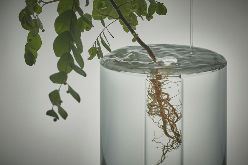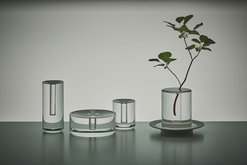 クリスタル製の花器。花器の縁から中心に向かってすり鉢状になっていることで、その浅瀬に水が溜まる仕組み。さらにそのまま水を満たすことによって表面張力を発生させ、花器と水の境目を曖昧なものとした。花器の存在感は薄れ、残るのは水の柱と植物だけのような錯覚に陥る。植物、水、そして花器という3つの要素が、人の立つ視点によって主役から脇役へ、脇役から主役へと変化する。