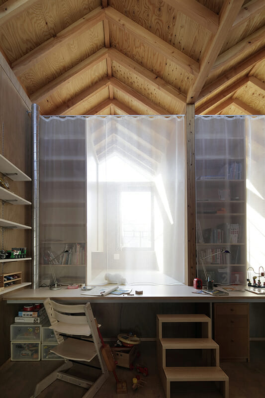 ギザギザ屋根で雨水を小分けに集め、その雨で育てられるグリーンルーバーにより、快適な室内気候が仕事場にもたらされます。ルーバーの表面はひんやりとしていて涼しい風が運ばれてきます。風にそよぐ緑は、風を視覚化しているようで、目に優しい。用途上の要請だけでなく、心地が良いから外部に開く、そんな職住融合の建築です。
