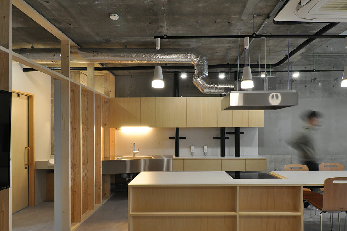 居宅介護支援ステーションとコミュニティスペースの合築プロジェクトで、東京西郊の大規模団地の空き店舗を改修しました。カフェというのはメタファーですが、住人同士の特技を楽しみながら営むコミュニティスペースになっています。奥には木の壁を設け、商店街からのアイキャッチとすると共に、活動を掲示したり、DIYで棚を取り付けて展示したりできるようにと考えました。