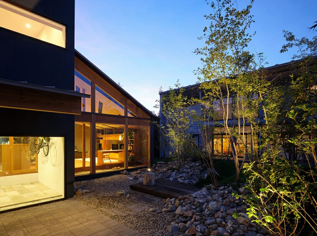 庭は、雨の多い気候の中でさまざまな楽しみ方ができるよう、緑豊かな庭とハードコートという2つの性格を持たせた。2つの庭の上にはいくつかの屋根を乗せ、その下を庭と連続して感じられるリビングやトレーニングスペース、駐輪駐車場やエントランスのベンチスペースとしている。