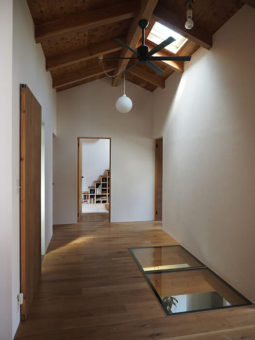 庭と家のリビングやアトリエが一体として使えるように、大きな開口や段差なく続く床で内外をつなげた。2階に登ると、棟梁の下の天井の高い空間が家全体をつなぐ役割を果たしている。家そのものはコンパクトな箱だが、それぞれの空間を行き来する体験は多様になるようデザインしている。