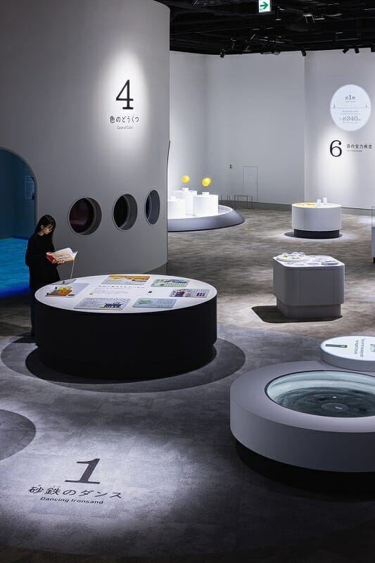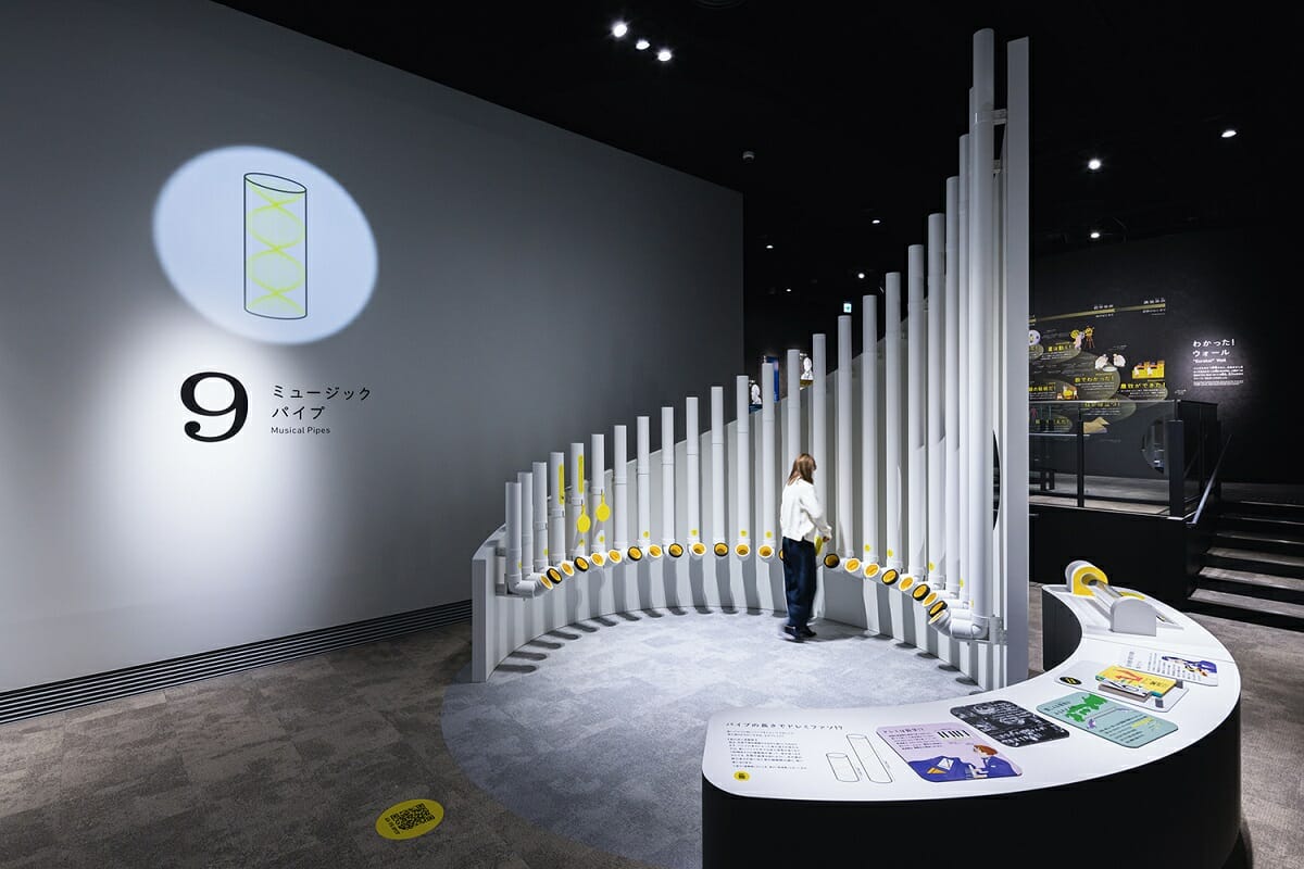 メインの展示は大きなサイズで迫力のあるシンボル展示と、実際に触れて体験できるシンボルミニ展示、示唆を与える映像、科学解説、関連書籍が各コーナーに配置されています。科学現象を直感的に伝えるビッグスケールのシンボル展示によって子どもたちへフシギの入口を開き、周辺に体験装置や科学解説を配置することで、より深い思考へつながる仕掛けを施しました。