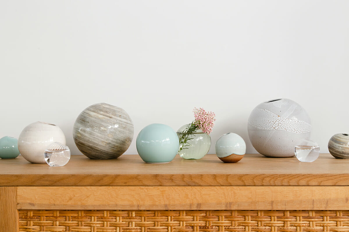 同ストアは、鈴木啓太が発起人となり、8軒の工房が参加する「ワン フラワーウェア」プロジェクトから誕生した。モダンな丸い花器を、ガラス、青磁、木工、唐津焼の陶器など、さまざまな素材や技術を使った全12コレクションで展開している。花器はすべて、職人の手によってつくられる世界にひとつだけの1点物だ。