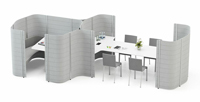 パネルの素材はノイズを低減するのに役立つだけでなく、無機的になりがちなオフィス空間に、その布のような表情で柔らかさを与える。パネルと座席は5色、天板と支柱は2色から選択可能。