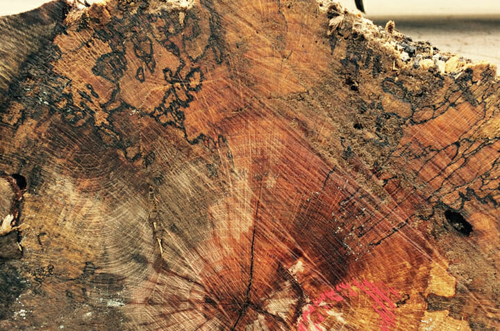 個性豊かな木目を持った花器は、富山県の虫喰いナラ材から作られている。虫喰いによる穴や、菌が入ることによってできる黒い墨模様(スポルテッド模様)は、同じものが2つとない、自然がおりなす表情だ。しかし、虫喰いの被害によって穴があいたり墨模様が入った木材は、「使えない」という考えから多くが山に放置されたり、おが屑などに加工されているのが現状である。