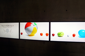 センサーの上で手を使って自分を思うりんごの大きさを表現すると、ディスプレイ上にりんご、ビーチボール、たまご、などその大きさに近い球体がディスプレイに表示される。りんごだけでも数多く登録されているとのこと。