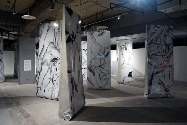 小山泰介と名和晃平のコラボレーションはなかなか刺激的。「OKAZAKI LOOPS」でも話題を集めた、名和晃平とダミアン・ジャレによるコンテポラリーダンス作品「VESSEL」のパフォーマーの身体データを3Dスキャニングし、コンピュータでシュミレーションした空間で“再撮影”。そのプリントをさらにハンドスキャンするという複雑なレイヤーの写真表現だ。