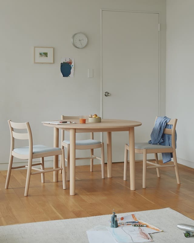 デザインの原点となったのは、2015年に廃番となったものの、現在もカリモク家具の工場食堂で使われ続けているチェア「CS1105」です。その力強く安心感のある太めのシルエットと、シンプルで愛らしい佇まいから着想を得て、現代の住環境に調和するかたちへと再構築されました。