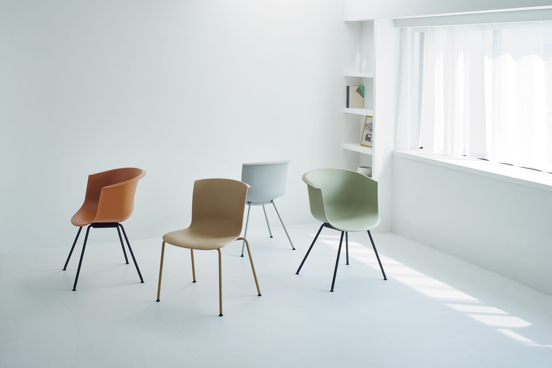 背もたれは背中の緊張をそっと受け止めるように湾曲し、柔らかく身体を包み込みます。シート部分は三次曲線を描く造形により、ほどよいホールド感と安定した座り心地を実現。やや細めのスチールフレームが軽やかな印象をもたらし、金属でありながら有機的で滑らかなラインが空間に静かな美しさを添えます。