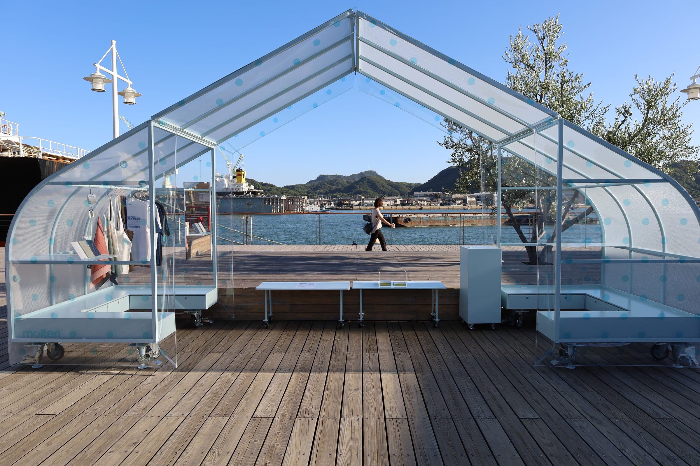 2つ目の移動型キオスクは、商業施設「ONOMICHI U2」に隣接する、海沿いのオリーブ広場に設置されています。中⼭英之さんと、競技用ボールの製造販売で知られる広島の株式会社モルテンのコラボレーションによってつくられました。半透明の膜材で覆われたキオスク越しに瀬戸内の海や空の景色が通り抜ける、気持ちのいい空間をつくりだします。